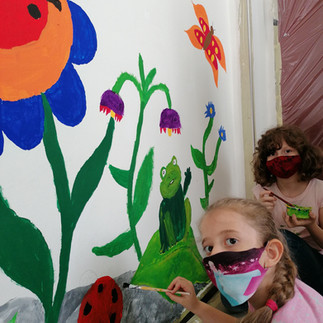 Bevor an der Wand gemalt werden durfte, lernten die Kinder die richtige Pinselführung und entwarfen Skizzen auf Zeichenpapier. Diese Entwürfe wurden zuerst mit Bleistift an die Wand gezeichnet und danach bunt angemalt.